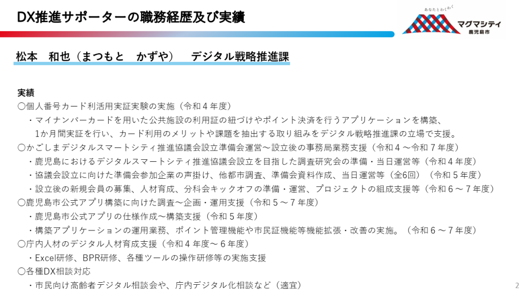 経営管理システムの構築やお客様企業における社内データ利活用支援組織における新規サービス立ち上げ~運用業務に従事。直近では鹿児島市デジタル戦略推進課への3年間の派遣の中で自治体DXを内側から支援。現場の声を聞きながら一緒になって腹落ち感のある変革を起こしていくことを目指している。(2025年9月時点)