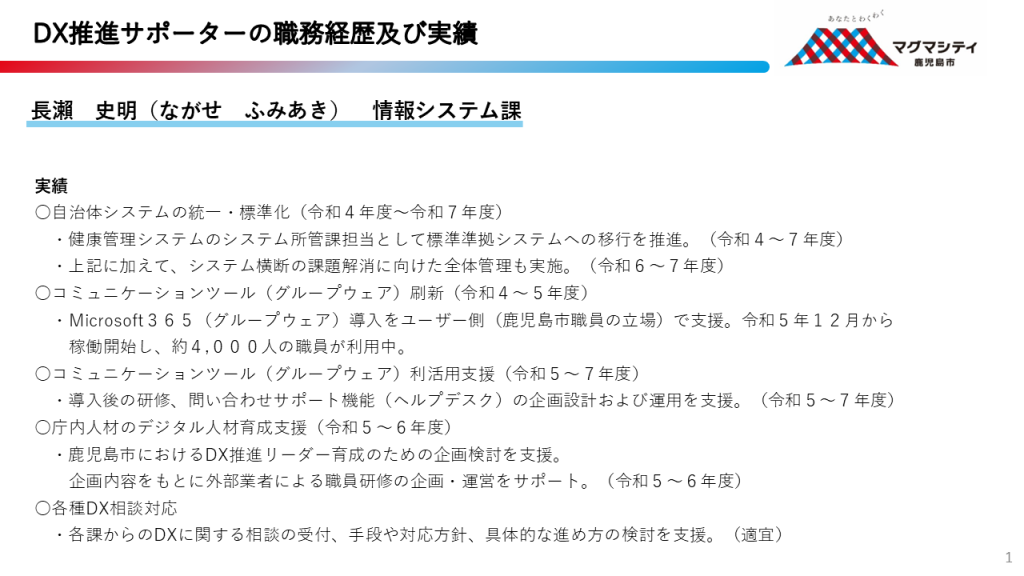 LTS入社後、システム刷新やテクノロジー導入に伴う業務分析~展開支援を幅広く経験。2022年9月から3年間、鹿児島市にDX推進サポーターと派遣され、全庁向けのグループウェア導入や庁内のDX推進リーダー育成研修の企画設計などを支援。(2025年9月時点)